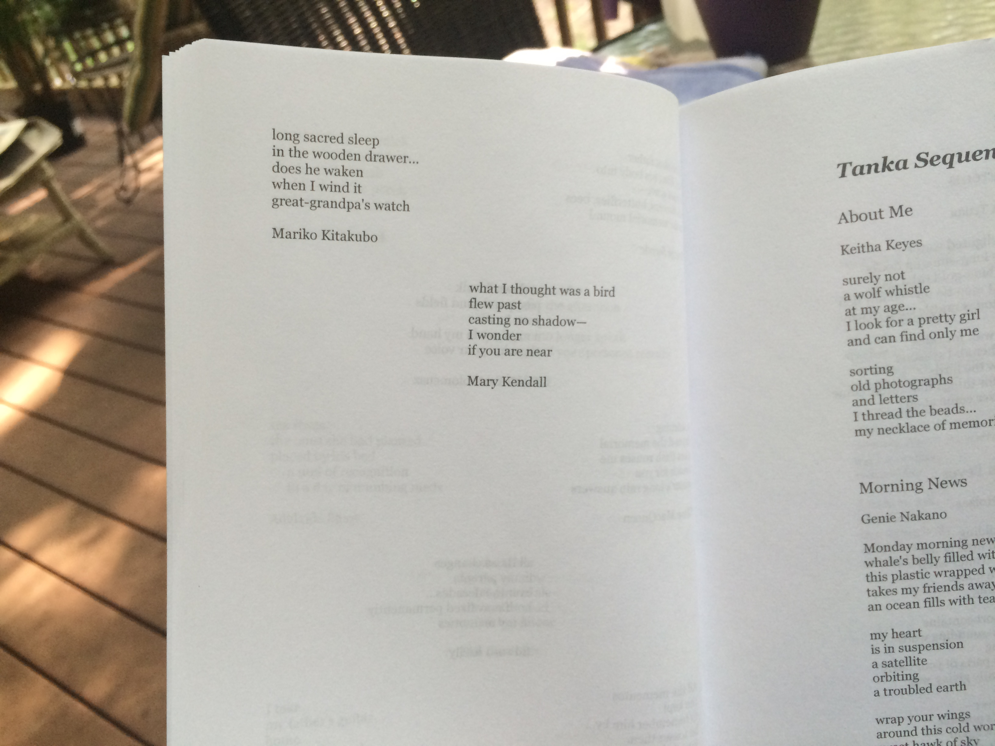 It is always a thrill for any poet to open up a journal and find her/his own poem nestled in among those of gifted writers. The truly excellent online journals of poetry in both tanka and haiku are really schools of learning for me. I go there to read, to fall in love with poems, and to learn from the very best writers. There is no better way to learn. Read, read, write. So, on the rare occasion, one of my poems makes it into those pages (paper or virtual), my heart is filled with joy.